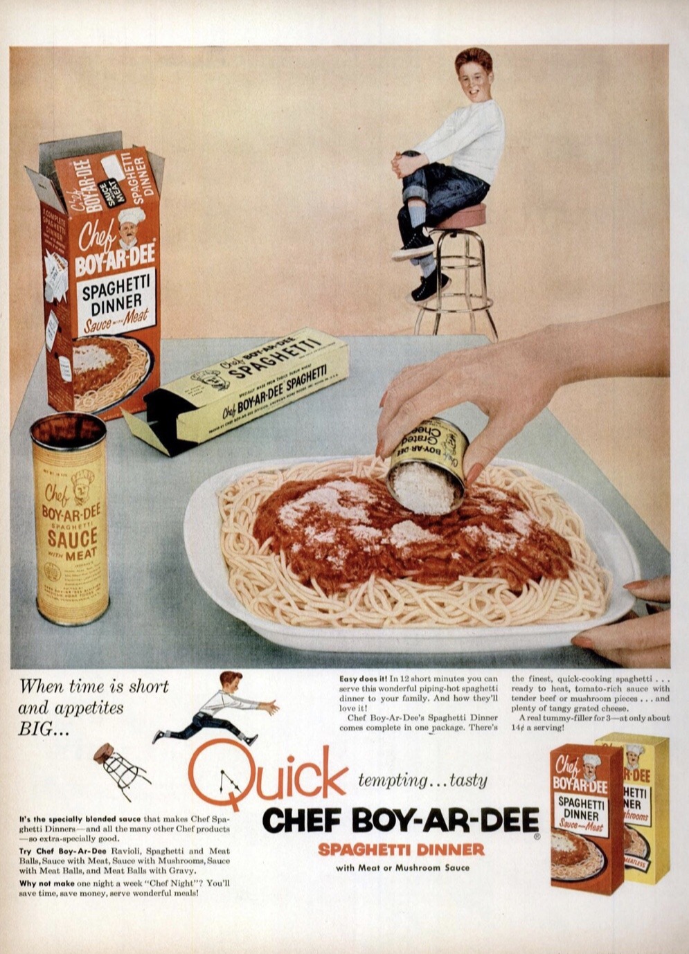 1954 Chef Boy-Ar-Dee boxed spaghetti dinner ad: