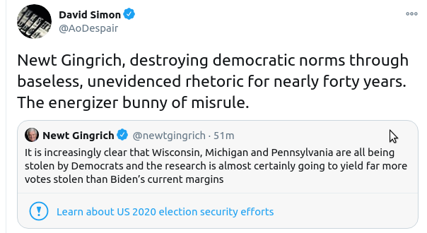 The energizer bunny of misrule Newt Gingrich, destroying democratic norms through baseless, unevidenced rhetoric for nearly forty years
