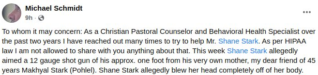 To whom it may concern: As a Christian Pastoral Counselor and Behavioral Health Specialist over the past two years I have reached out many times to try to help Mr. Shane Stark. As per HIPAA law I am not allowed to share with you anything about that. This week Shane Stark allegedly aimed a 12 gauge shot gun of his approx. one foot from his very own mother, my dear friend of 45 years Makhyal Stark (Pohlel). Shane Stark allegedly blew her head completely off of her body.