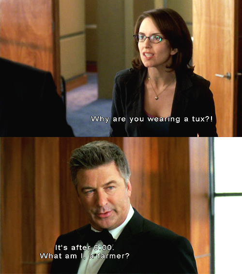What am I, a farmer? Liz Lemon: Why are you wearing a tux? Jack Donaghy: Its after 6:00. What am I, a farmer?